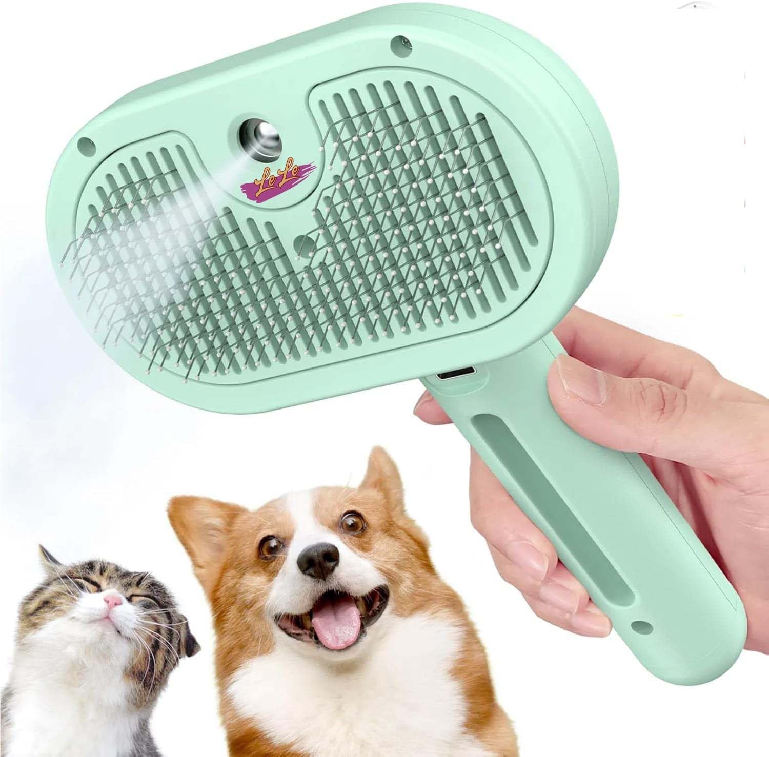 Anti-Static Spray The spray function ensures efficient hair removal without static electricity, keeping your pet’s coat sleek and shiny Its water tank allows for easy addition of water, deodorants, or hair softeners, enhancing grooming effectiveness. Convenient hair removal button swiftly clears collected dander and loose hair, maintaining cleanliness The hair will leave on brush after grooming, and just simply press the self-cleaning button, the pet hair can be easily peeled off from the brush. You do not need to take time to clean brush. Thick teeth to massage and groom, slim teeth to deshed and collect hair. Suitable for all home Pets like cat, dog, rabbit, goat and etc. It is made for your pet’s comfort and enjoyment. Your pet will love our new massage and grooming brushes! Suitable for Long and Short Hair. While grooming the pet hair, it can also promote the blood circulation of pets. Effectively removes knots and tangles, promoting a healthier coat and reducing discomfort for pets. High Quality Handle, More Comfortable Grip Easy One-Touch Hair Removal Anti-Static Smoothes Hair Removes Flying Hairs Round & Curved Deep into the hair